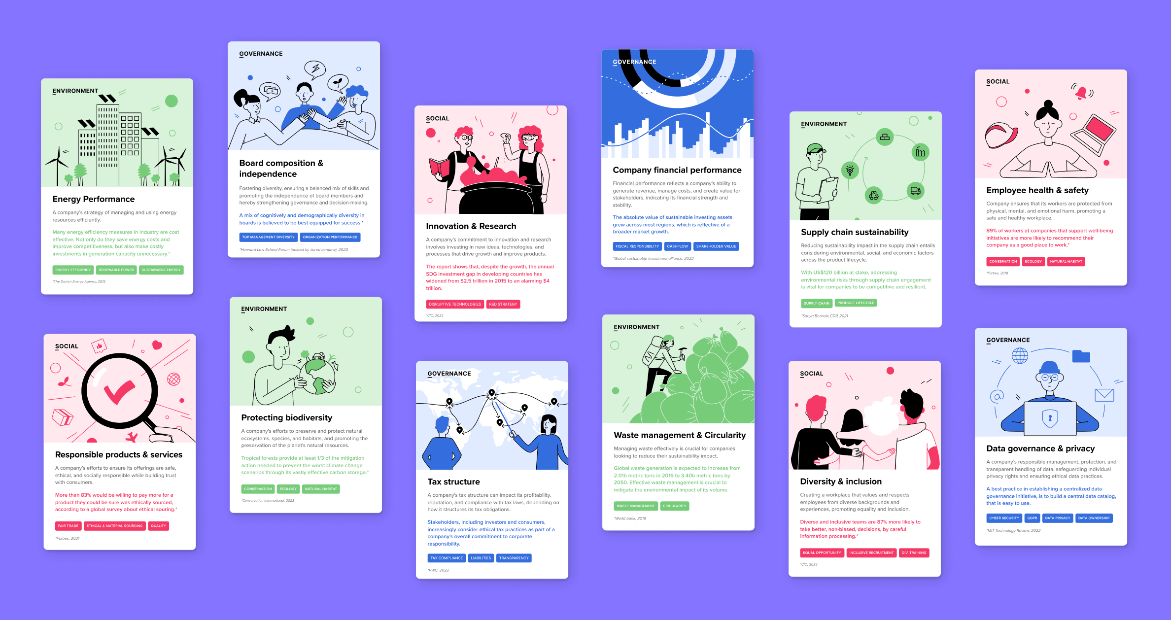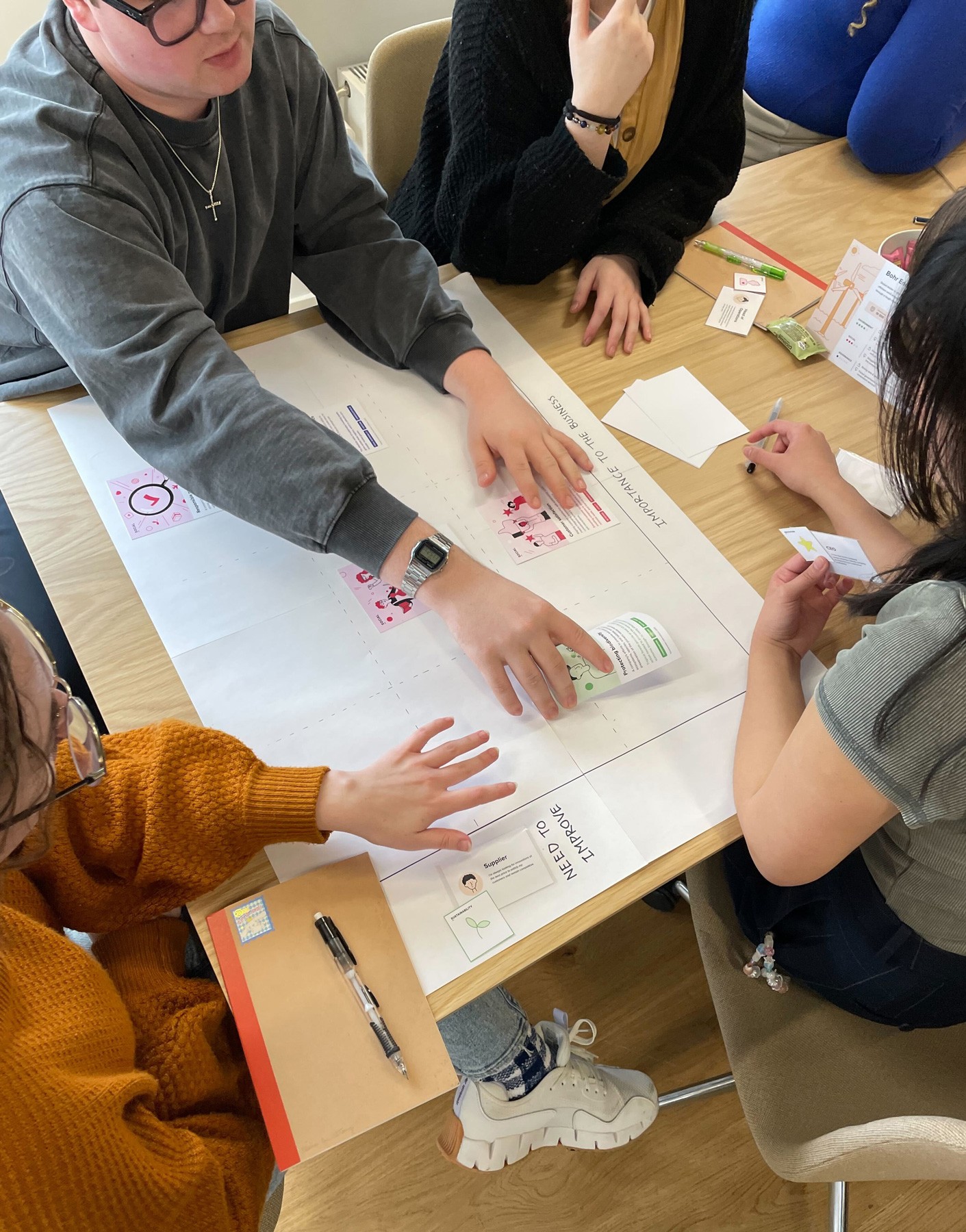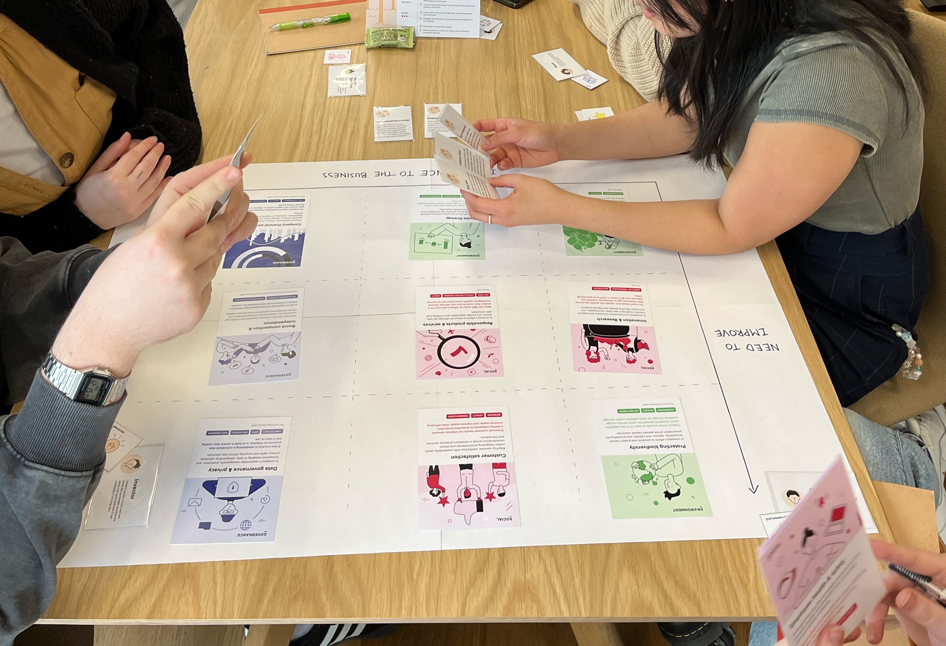 The ESG Navigator Deck is a facilitation card deck designed to spark conversations about ESG and help companies explore potential strategies. It encourages knowledge exchange across departments and colleagues highlighting how different roles perceive the impact of various changes. For instance, a sustainability officer may prioritize waste management differently than an operations manager due to their distinct responsibilities. Our game playfully reveals these nuances through this discussion and prioritisation exercise.